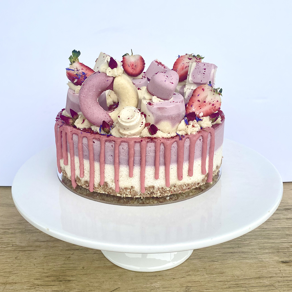 A vanilla almond crust forms the start of this cake with a beautiful creamy coconut white chocolate layer. It ticks all the boxes for fruit lovers, complete with a zesty raspberry topping and edible toppings, its a match made in heaven.
